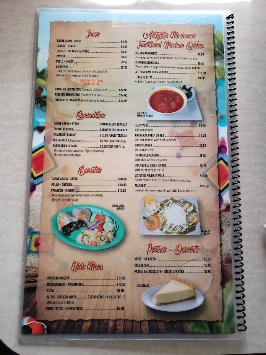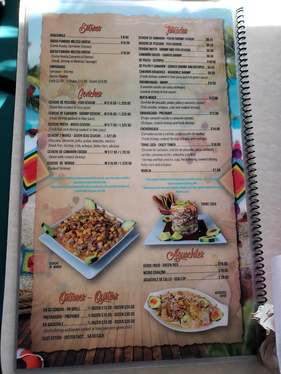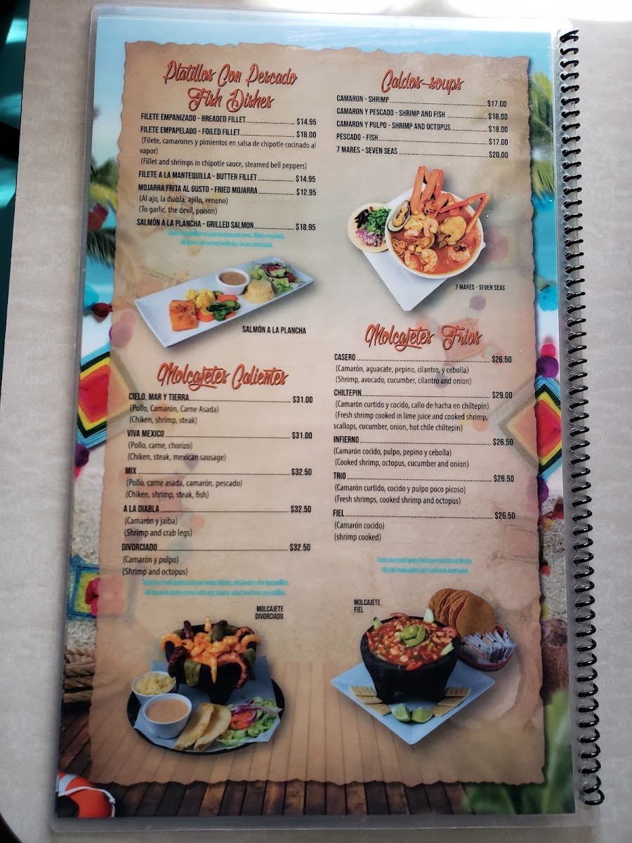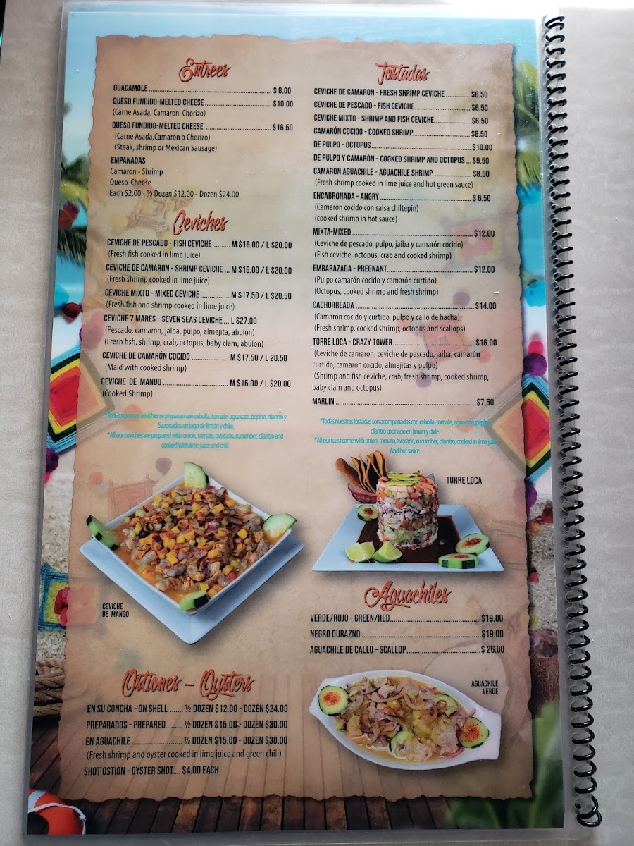 Camarones al patron, camarones empanizados, camarones al mojo de ajo, camarones y pulpo a la diabla, mojarra frita, filete empanizado, fajitas mixtas, quesadillas, arroz, frijoles y ensalada.
