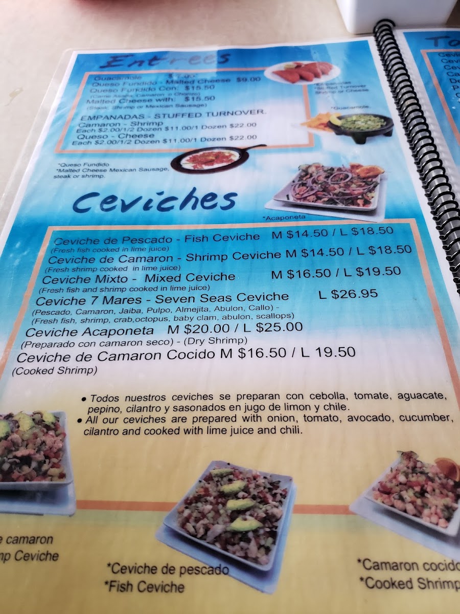 Ceviche de camaron, ceviche de pescado, pulpo, botana de cmaron cocido y pulpo, camaron curtido, aguachile de callo de hacha, ostiones en su concha, camarones pera pelar.